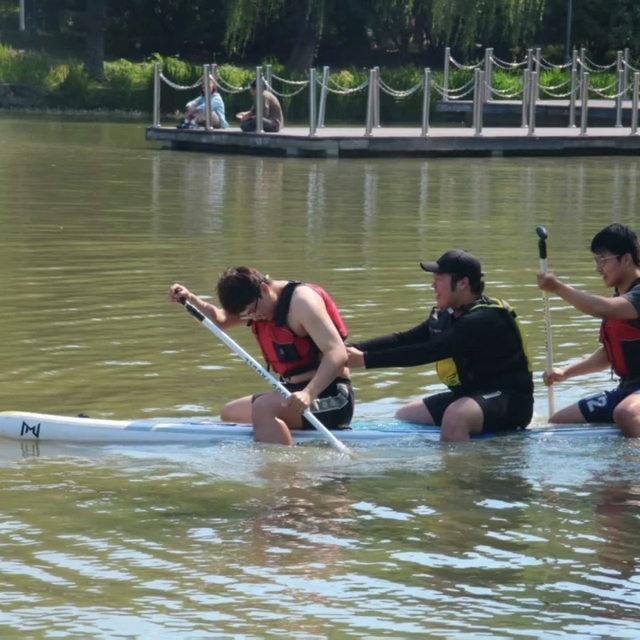 规则:两人同乘一块桨板,采用跪姿划桨,单次比赛计时决出名次,考验彼此的配合与节奏把控。