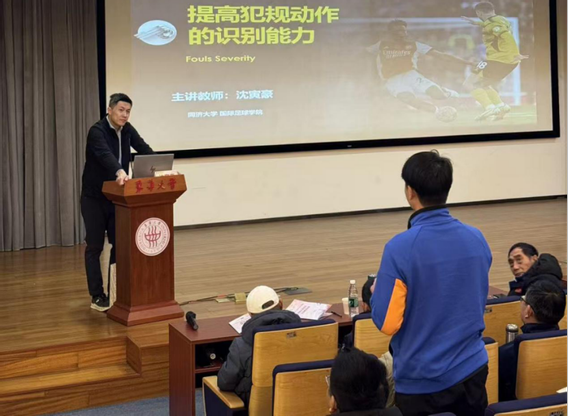 裁判员培训会上,中国足协裁判技术讲师、中超联赛裁判监督、上海足协裁委会副主任陆建平以《提高识别越位犯规的能力》为题开展讲解,通过典型实战案例分析,系统梳理了越位犯规判罚的关键要点与常见问题。中国足协裁判技术讲师、中超联赛裁判监督、山东省足管中心社会足球部部长姚庆以《提高识别手球犯规的能力》为题,结合竞赛规则与实际执裁经验,重点解读了不同比赛情境下对“故意性”“手臂位置”和“获利结果”等判罚要素的综合判断。国际级足球裁判员、亚足联精英裁判员、同济大学国际足球学院副院长沈寅豪以《提高识别争抢犯规的能力》为题,从比赛中常见的身体争抢情形入手,系统阐释了“不构成犯规的合理对抗”“草率的犯规”“鲁莽的犯规”以及“使用过分力量的犯规”等不同判罚类型的区分标准。国际级足球裁判员、中国足协裁判技术讲师马宁讲授了《足球竞赛规则最新动态》,围绕最新规则变化与执裁实践中的重点难点进行解读,并结合执裁实践对相关重点条款进行了说明。