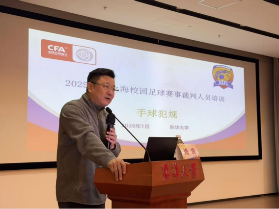 2026年1月24日,2025赛季上海市校园足球赛事裁判人员培训及总结活动在东华大学松江校区顺利举办。本次活动由上海市校园足球发展中心主办、东华大学承办,汇聚了来自全国各地的精英讲师及上海市190余名校园足球裁判员。