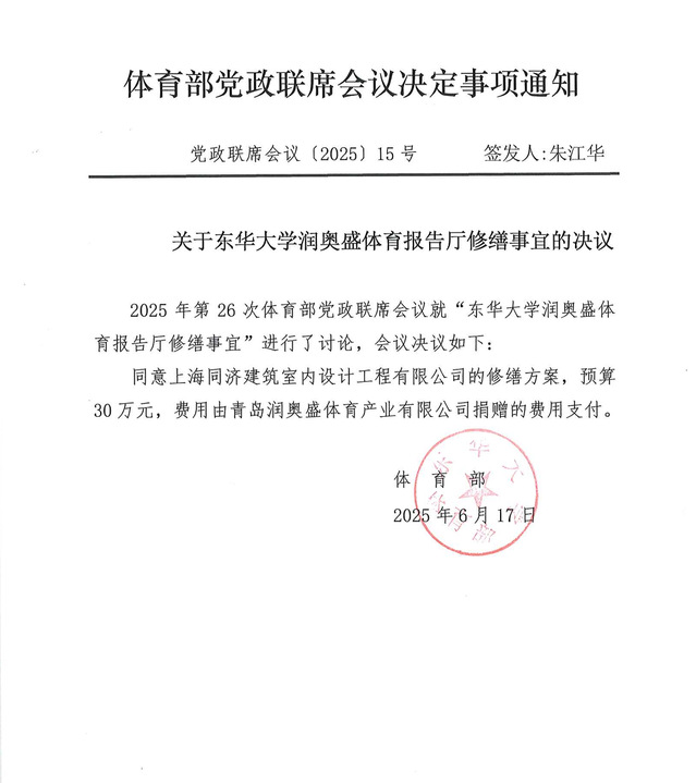 关于东华大学润奥盛体育报告厅修缮事宜的决议