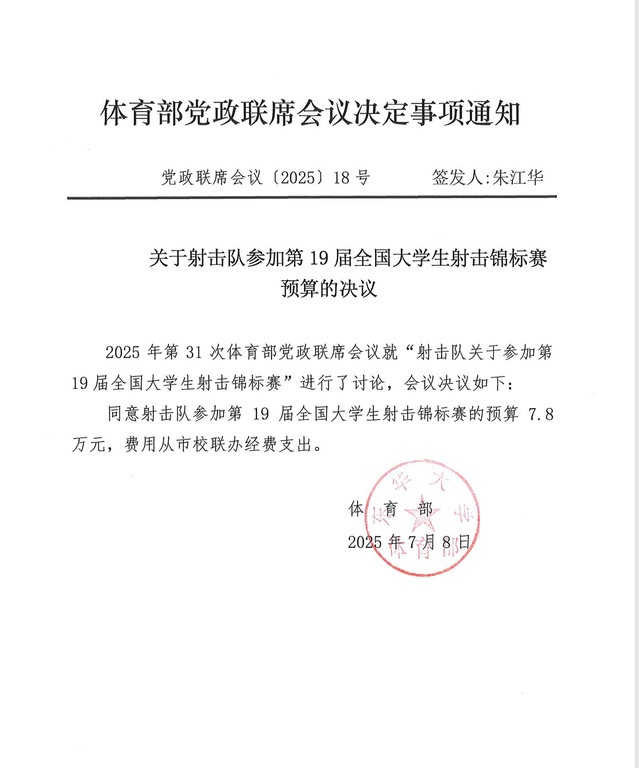 关于射击队参加第19届全国大学生射击锦标赛预算的决议